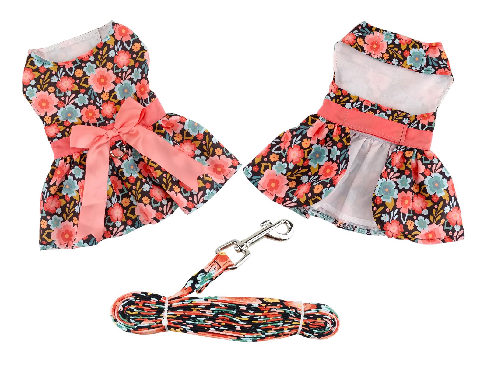 We think this floral dog dress is peachy keen! Blue and peach flowers cover this adorable dog dress. A peach waistband and matching bow complete the cuteness.